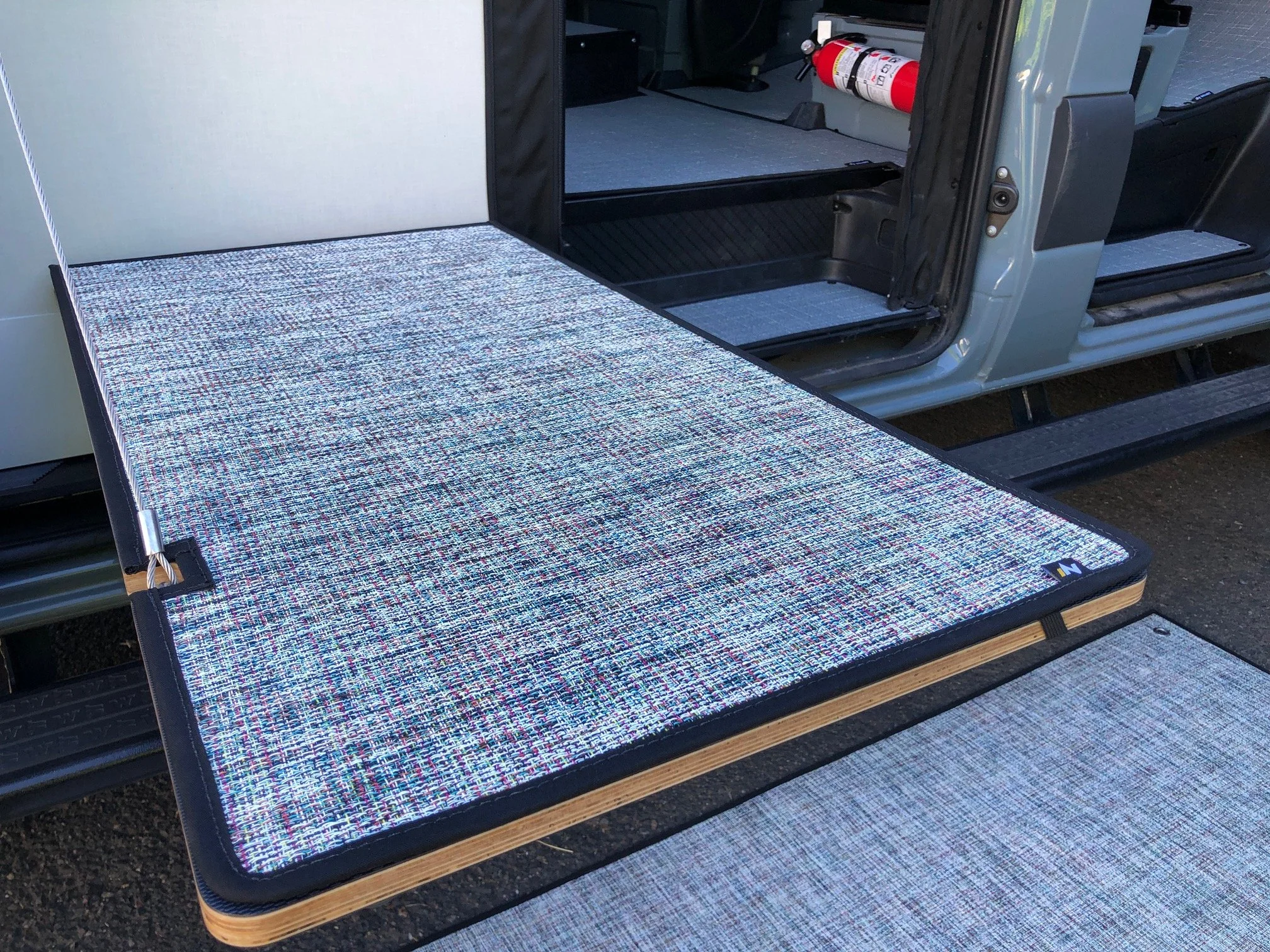 Our Exterior Fold-Down Table Mats cover the entire surface of the factory table and includes a built-in elastic strap on the backside that stretches around the table to hold it in place when there’s excessive wind. Its has a non-slip latex backing and is notched to go around the nylon strap that supports the table top.