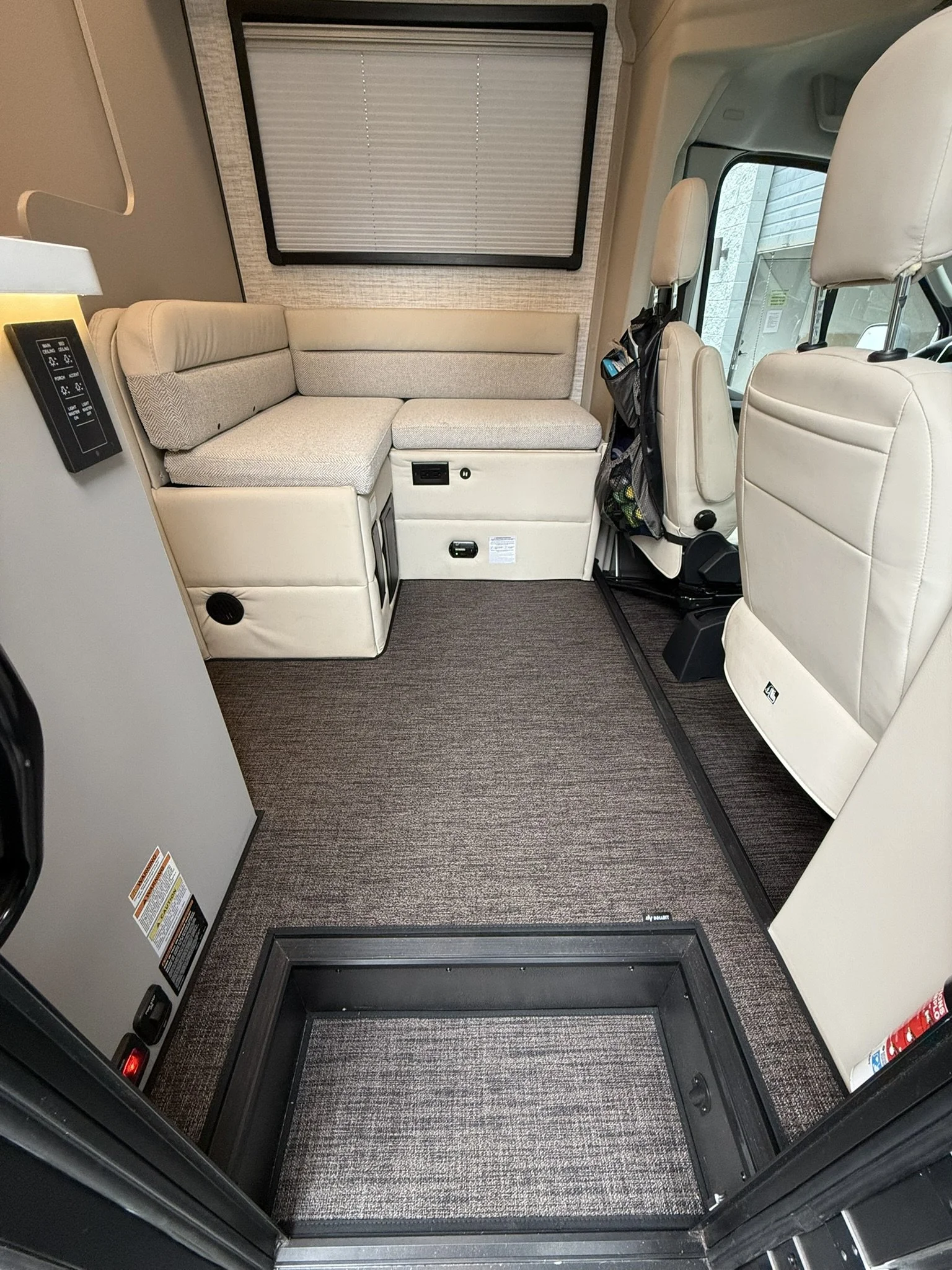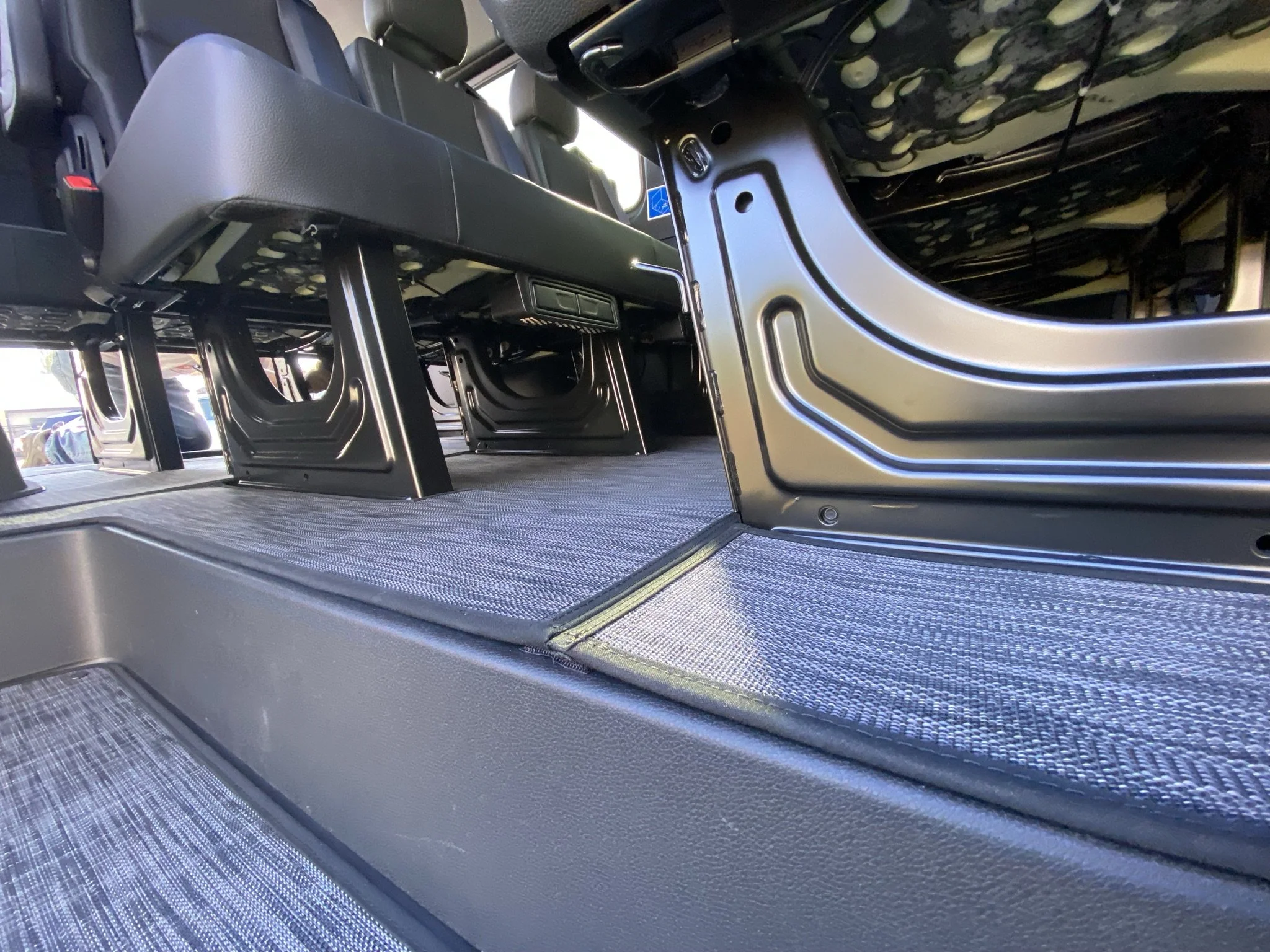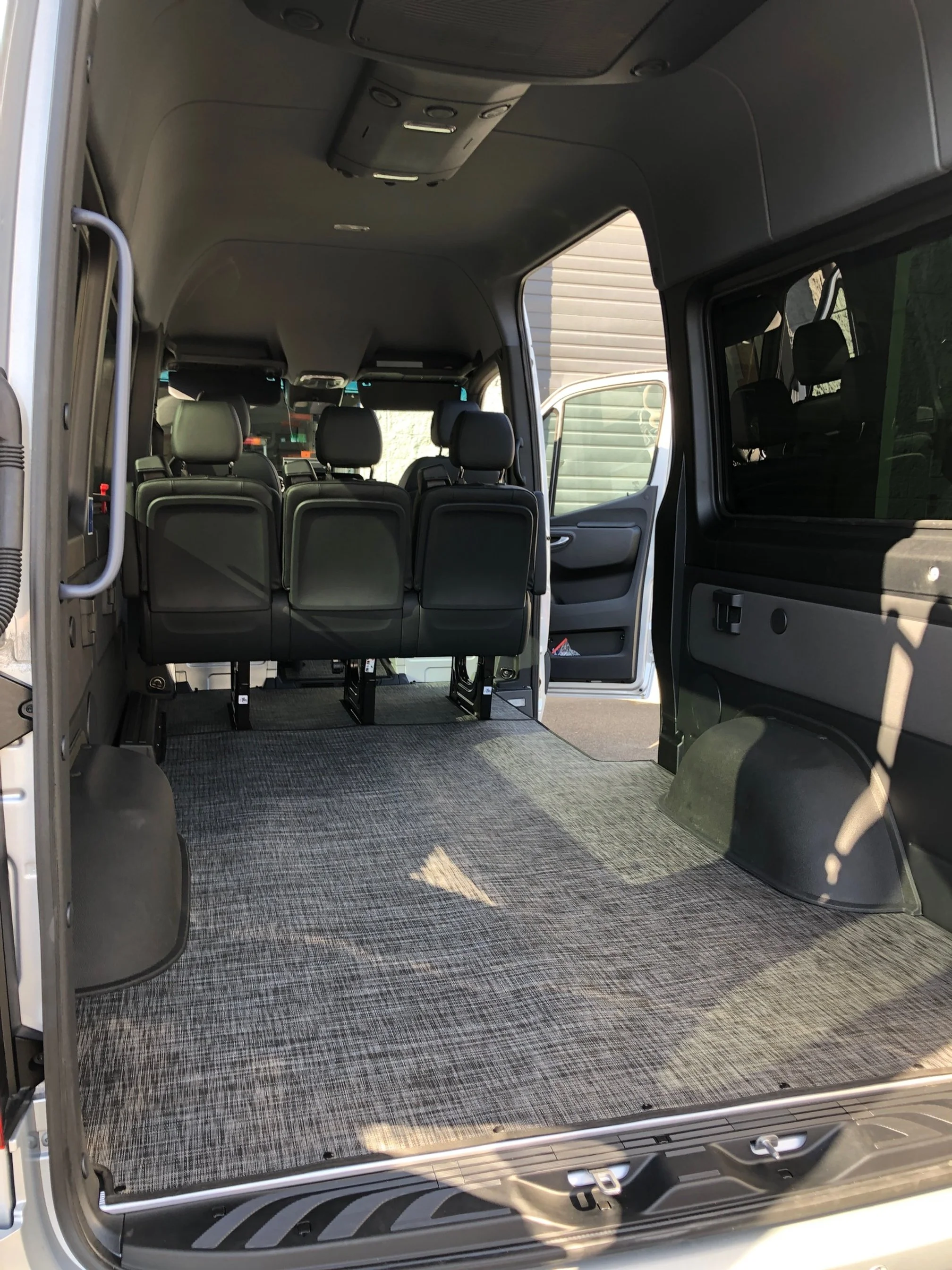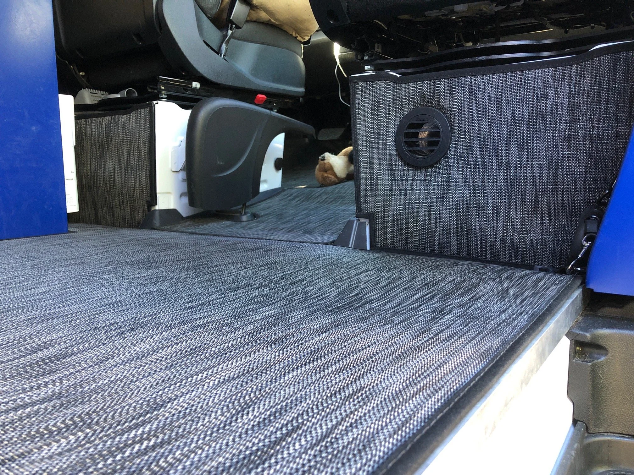 To clean, wipe with a damp cloth or remove them and rinse off using just water (no chemical cleaners are needed!). You can even pressure wash them per our instructions. Our personal favorite is opening up all the doors in the van and blowing the floors out with our battery-powered leaf blowers.
